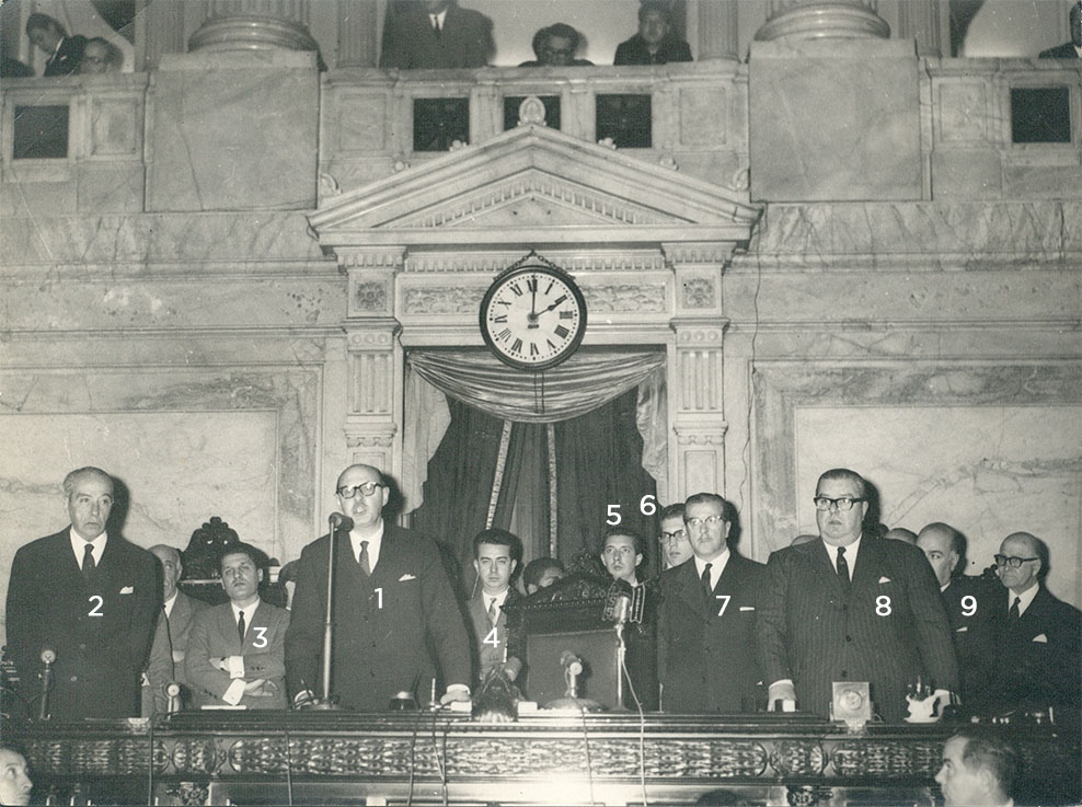 El presidente de la H. Cámara de Diputados de la Nación Arturo Mor Roig* pronuncia su discurso durante la sesión preparatoria del 12 de agosto de 1963. Lo acompañan el secretario parlamentario Eduardo T. Oliver, el director de comisiones Hugo Armento, el director de mesa de entrada Alfredo Bustos, los funionarios de la secretaría administrativa Carlos Barcia y Norberto Noblía, el relator del recinto Obdulio Espósito, el secretario administrativo Guillermo González y el prosecretario paralamentario Enrique A. Pardo, entre otros.