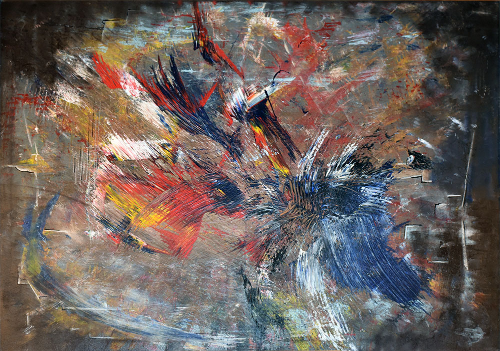 El color refuerza esta intensidad mediante una paleta contrastada de azules profundos, rojos encendidos, blancos y amarillos, aplicados con gestualidad marcada y capas superpuestas. La materia pictórica, espesa y trabajada con arrastres visibles, enfatiza la fisicidad del gesto y la huella del proceso. Zonas de mayor densidad conviven con áreas erosionadas, generando ritmos visuales que alternan saturación y desgaste, y subrayan una atmósfera de conflicto y energía contenida.