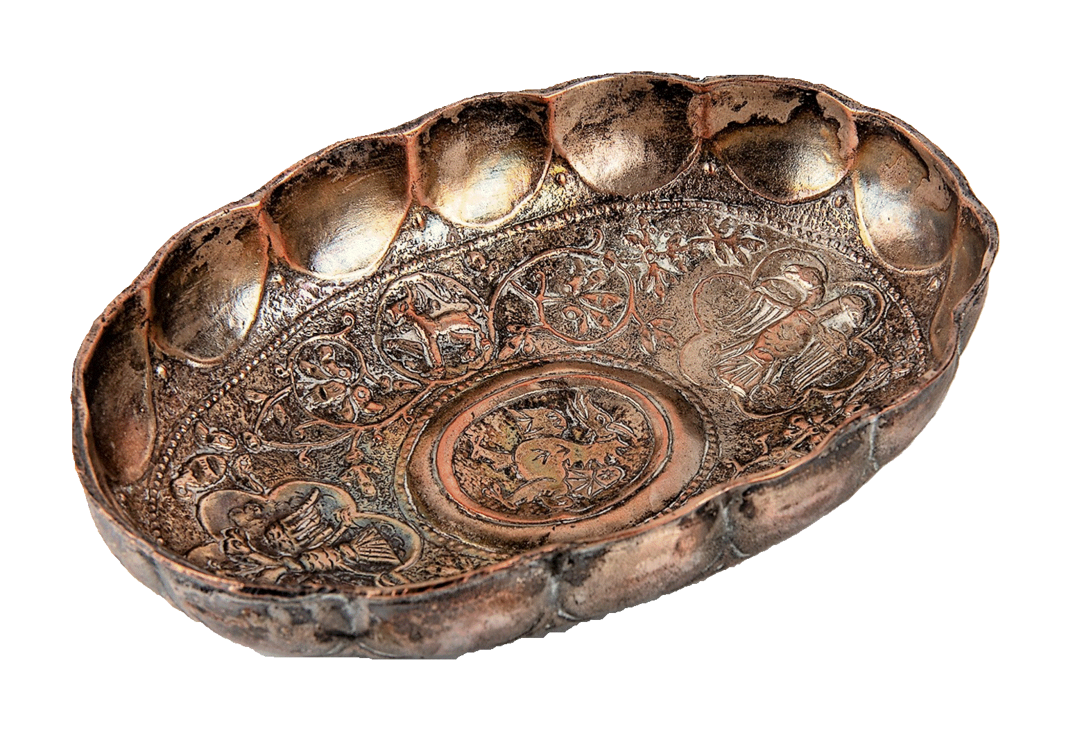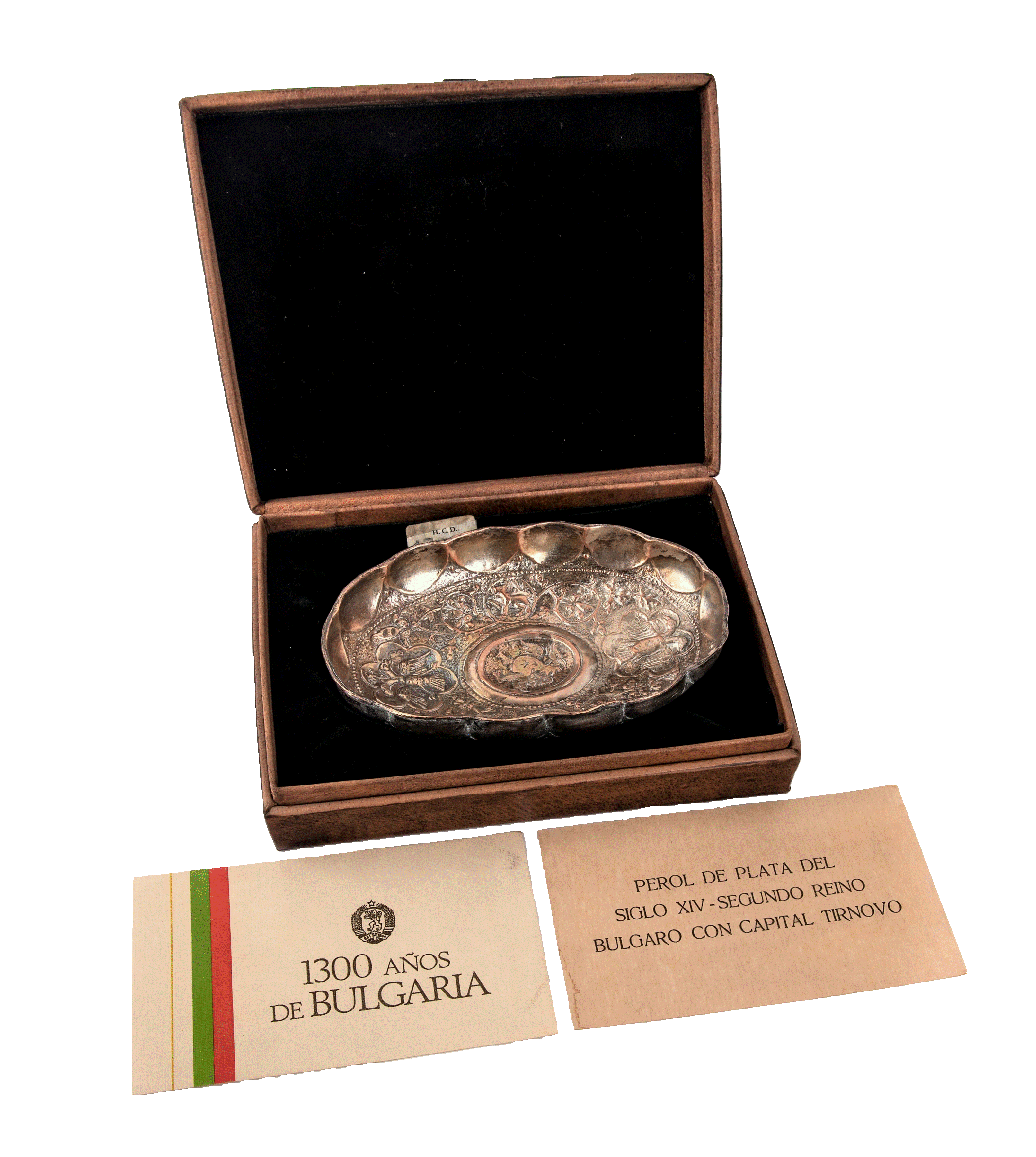 Pieza de artesanía en plata inspirada en modelos originales del siglo XIV, pertenecientes al Segundo Reino Búlgaro (1185–1393), cuya capital fue la histórica ciudad de Tarnovo. El objeto se conserva en su estuche original de presentación, de forma rectangular y estructura rígida. El exterior está revestido en cuero de tono marrón oscuro, mientras que el interior presenta un forro de terciopelo negro en la base. El perol fue acompañado por una nota explicativa que detalla su filiación histórica y simbólica, aludiendo al esplendor cultural de Tarnovo en ese período.