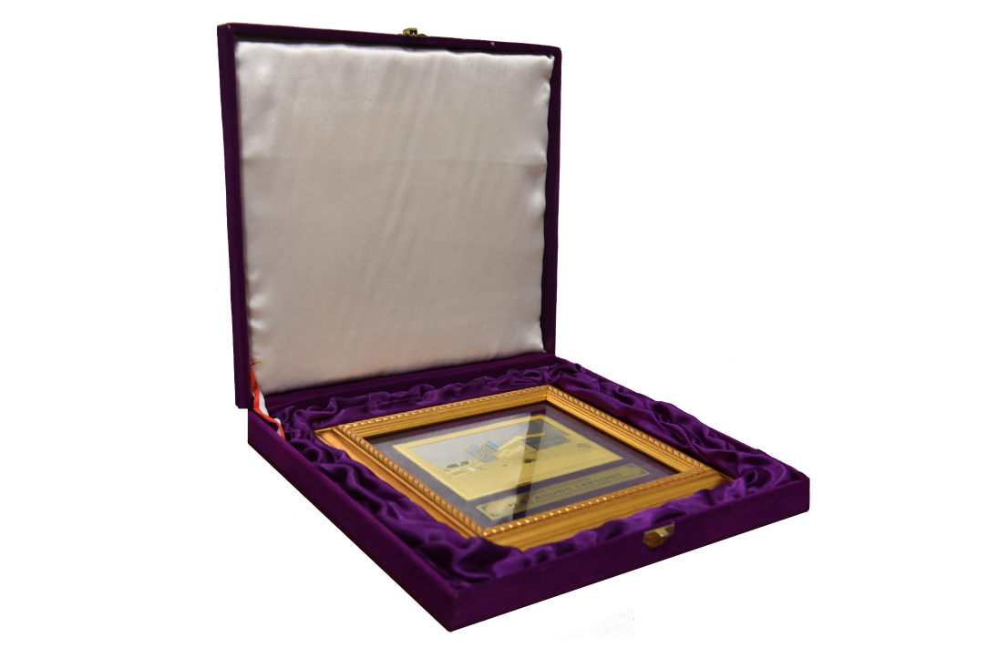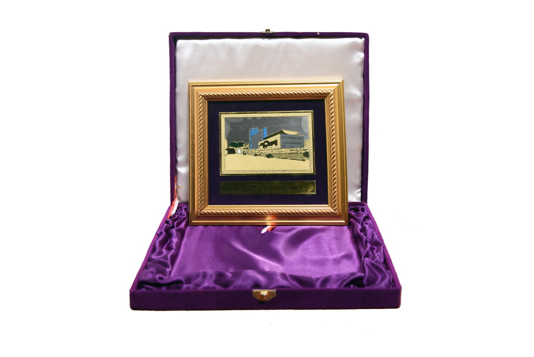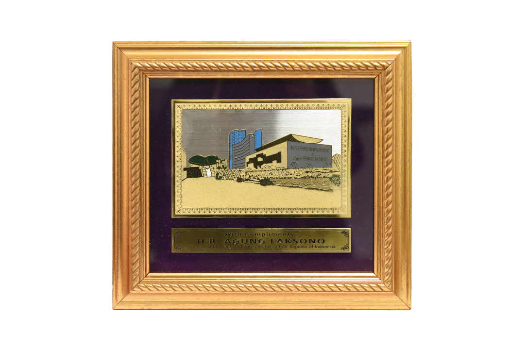 Placa enmarcada con representación en relieve de la sede de la Majelis Permusyawaratan Rakyat (Asamblea Consultiva Popular) de la República de Indonesia, órgano que, en el sistema constitucional de ese país, cumple funciones equivalentes a las del Poder Legislativo argentino, con estructura bicameral integrada por la Cámara de Representantes (Dewan Perwakilan Rakyat) y el Consejo de Representantes Regionales (Dewan Perwakilan Daerah). La pieza incluye una leyenda grabada en inglés que indica su carácter protocolar: “With Compliments: H.R. Agung Laksono. Speaker of the House of Representatives of the Republic of Indonesia” (“Con cortesía: H.R. Agung Laksono, presidente de la Cámara de Representantes de la República de Indonesia”). Se conserva en su estuche de presentación original, forrado en satén blanco y terciopelo púrpura.